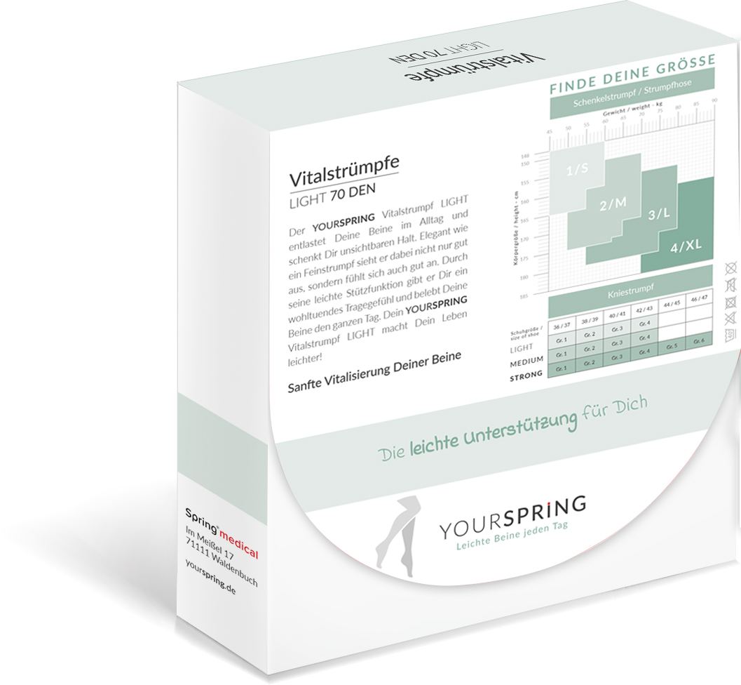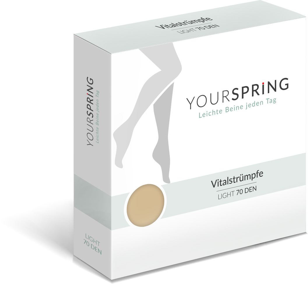 YOURSPRING Vitalstrümpfe entlasten Deine Beine und schenken Dir unsichtbaren Halt. Als modische Alltagsbegleiter sehen sie nicht nur gut aus, sondern fühlen sich auch gut an. Durch ihre leichte bis deutlich spürbare Stützfunktion halten sie Deine Beine fit und bieten Dir angenehmen Tragekomfort.